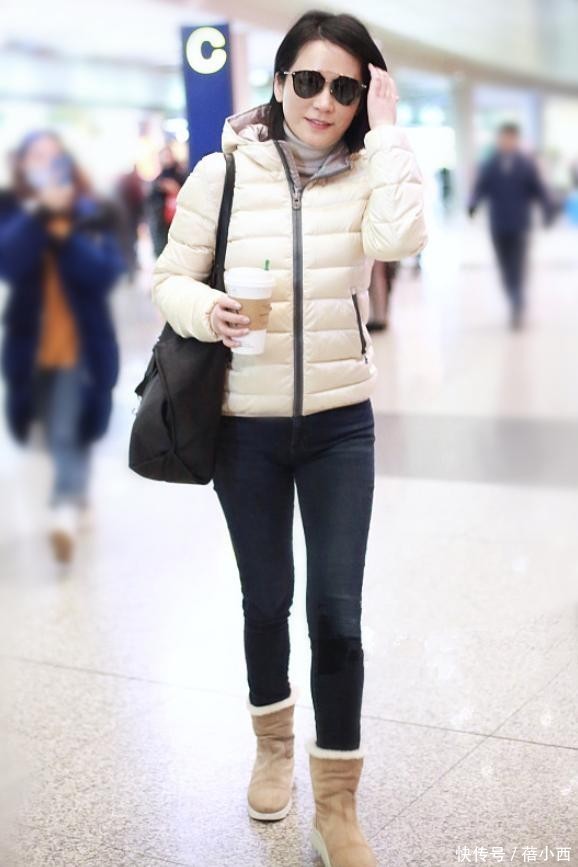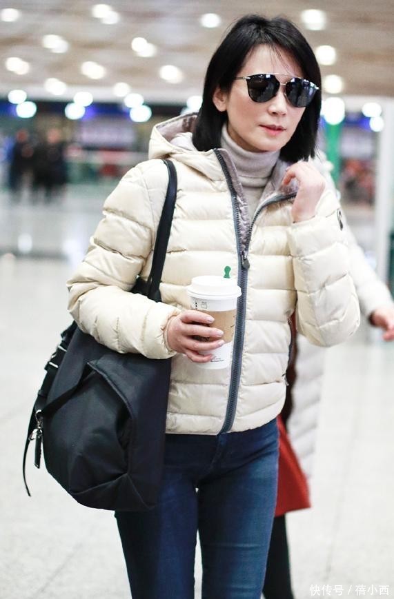 短款羽绒服穿身上让人多了一份干练感,如果你腿又细又直,那么腿上可以配一件修身型裤子。俞飞鸿腿上这条牛仔裤是深蓝色,与米白色羽绒服刚好一深一浅,使得整体穿搭更洋气了。