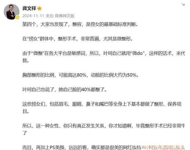 总之因为她干的各种奇葩事情,大家纷纷觉得小明哥的眼光不咋样,尤其是再一对比他的前妻,那简直是天差地别了。 当时还有个博主龚文祥,那简直是对叶女士的评判贬低到了极点。